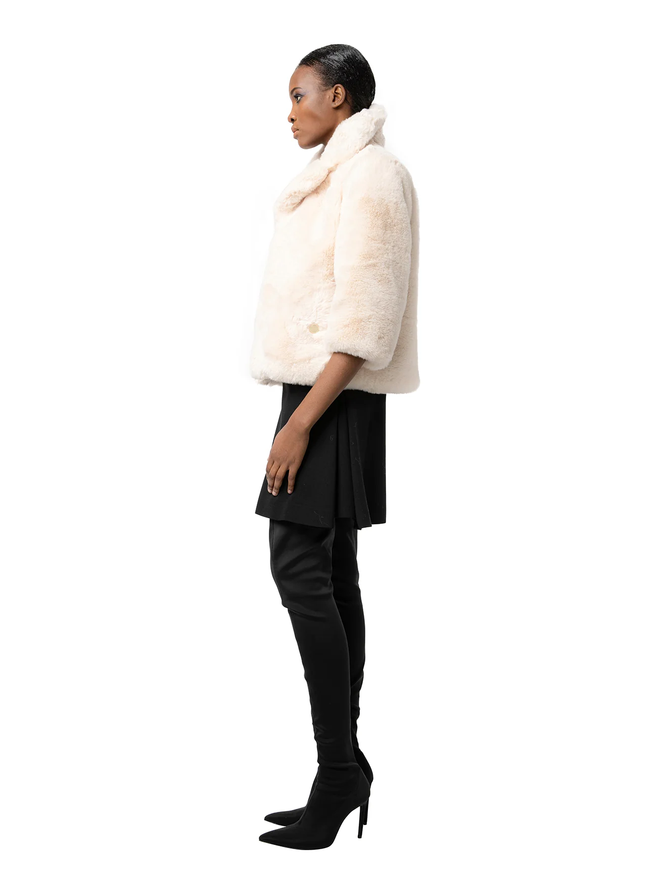 Chic and endlessly versatile, the Wendy is your go-to piece for polished layering. Crafted from plush cruelty-free fur, this cropped silhouette is designed to slip seamlessly over everything from denim to evening dress —more blazer than outerwear, but just as warm. With a slim fit, notch lapel, and ¾ sleeves, it adds a sophisticated finish to any look without the bulk. Wendy isn't just a coat—it’s the final touch.